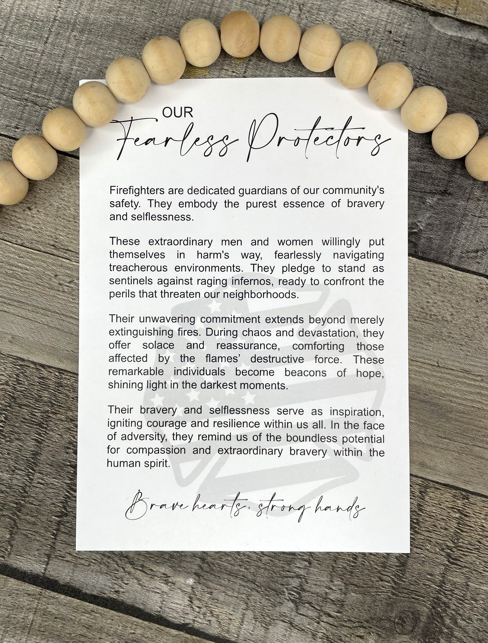 Honor the bravery and dedication of firefighters with this "Our Fearless Protectors" wooden ornament. Featuring a fire helmet design with an American flag motif, this ornament is a heartfelt tribute to the courage and selflessness of those who protect our communities. It comes with a card that beautifully captures the spirit of a firefighter's commitment, making it a perfect gift for those who serve or support them.